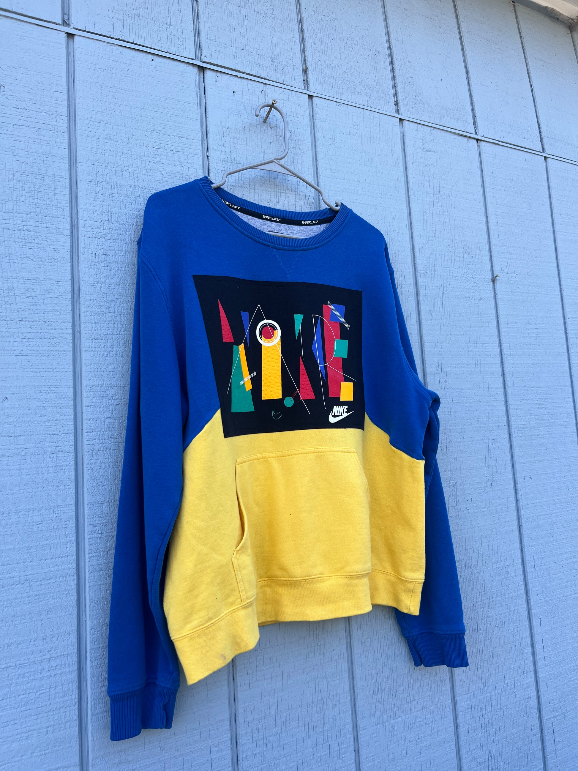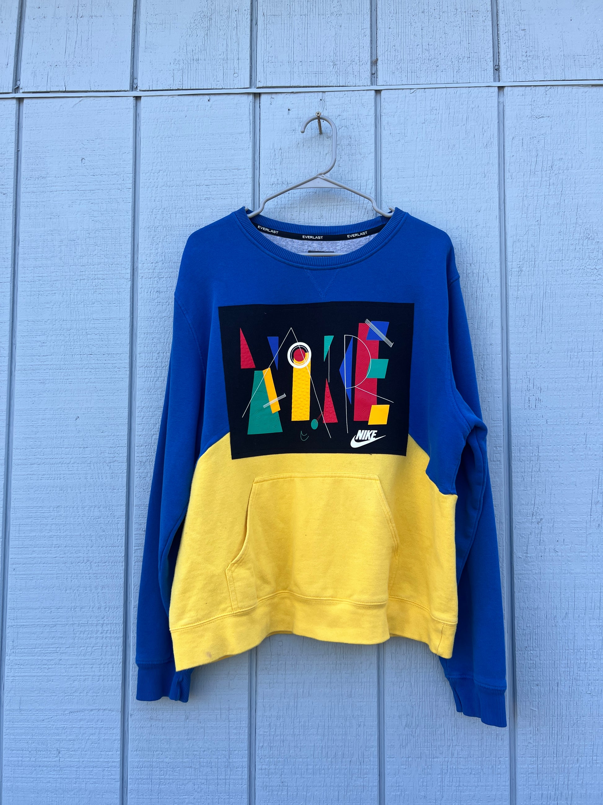 Turn up the brightness with this bold and colorful piece! This upcycled sweatshirt features a vibrant blue top half and a sunny yellow bottom — complete with cozy pockets for that laid-back, comfy vibe. The star of the show? A textured, multicolored Nike print set against a sleek black background, adding a pop of contrast and major personality.