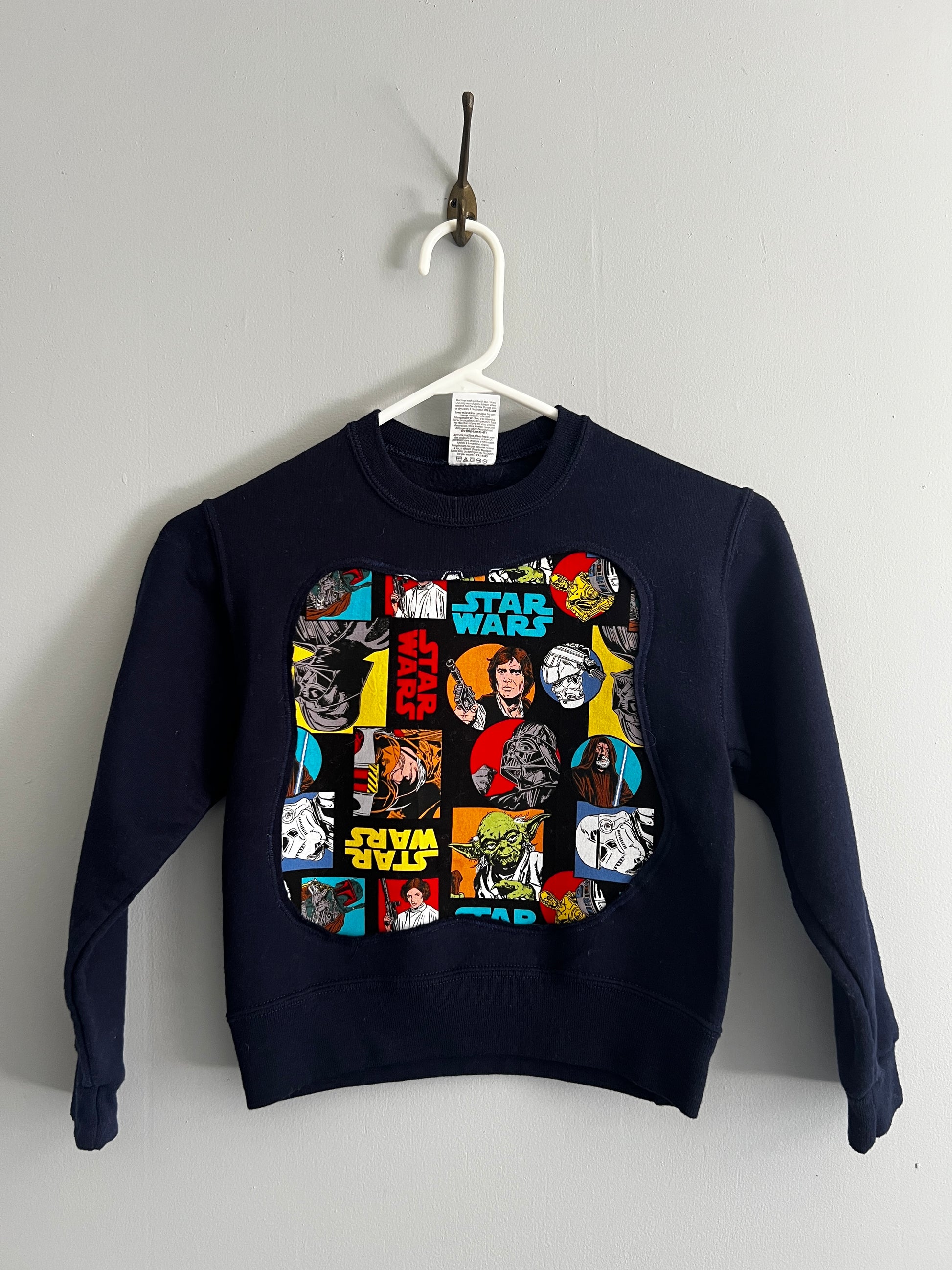 This cozy and creative upcycled hoodie is perfect for little Star Wars fans! Originally a classic navy hoodie, it’s been transformed with vibrant, multi-colored Star Wars-themed fabric inserts that add a fun and adventurous twist. The bold inserts feature a mix of iconic characters, making this a standout piece in any kid’s wardrobe.