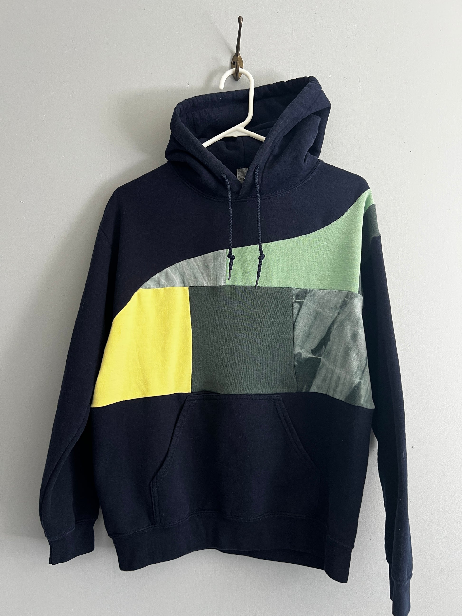 This unique upcycled hoodie blends comfort, color, and character. Originally a classic navy piece, it has been reimagined with vibrant teal and multi-greenish tones, paired with light yellow fabric inserts for a fresh, playful contrast.