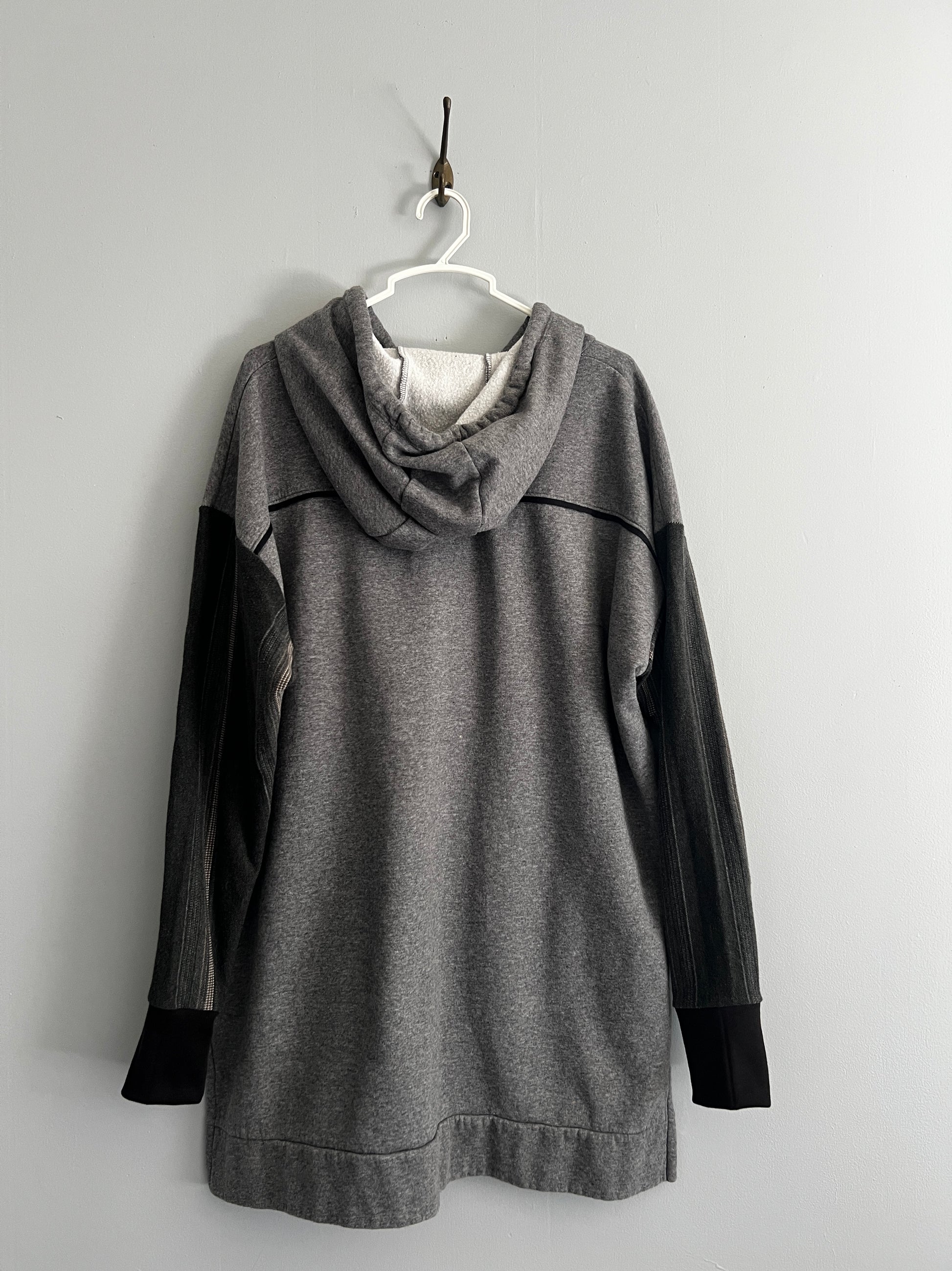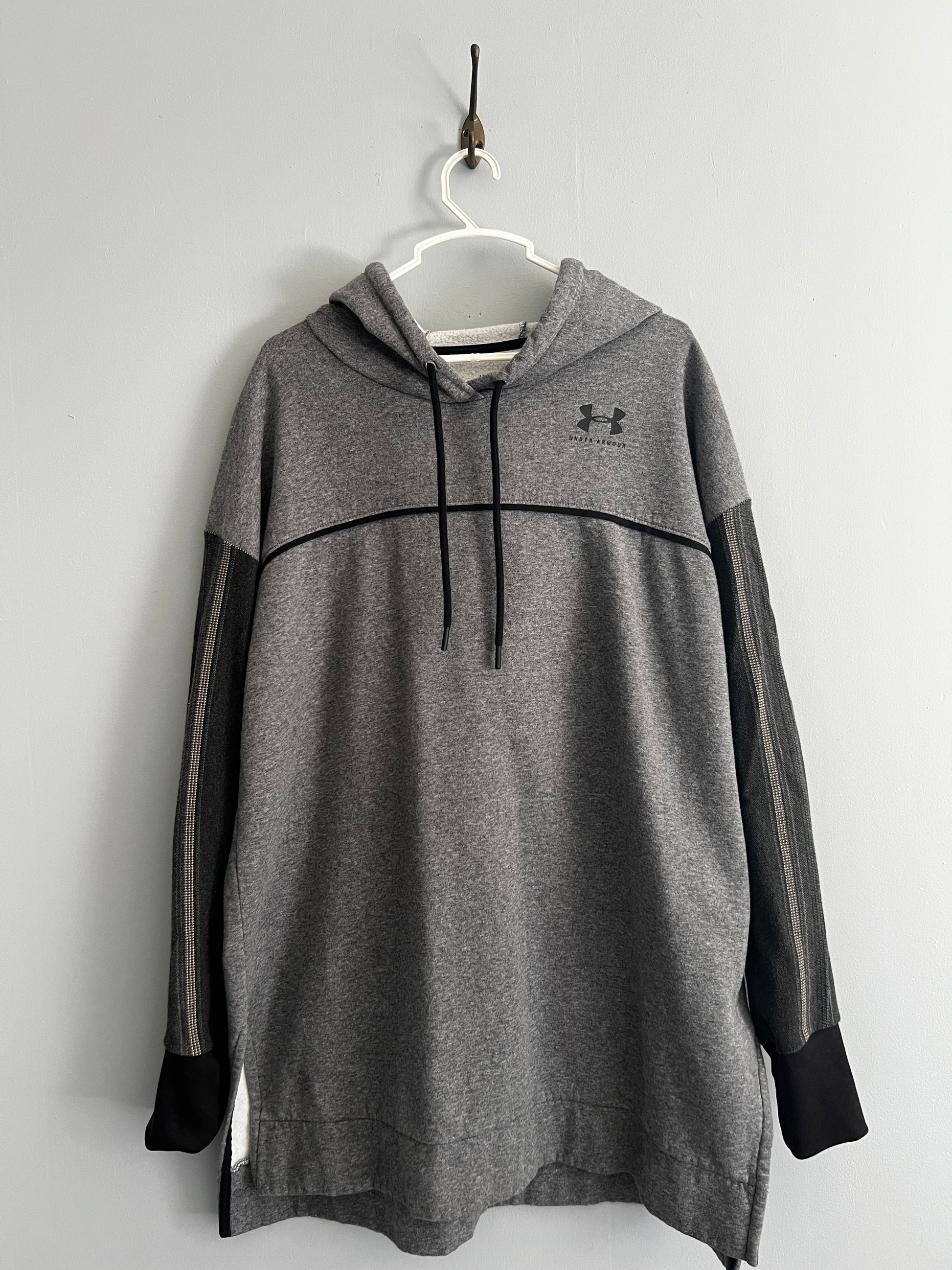 This upcycled grey Under Armour original hoodie has been reimagined into a bold, one-of-a-kind piece. Featuring carefully added patterned grey sleeve inserts, it brings subtle texture and dimension to the classic athletic design—perfect for anyone who appreciates unique details with a sporty edge.