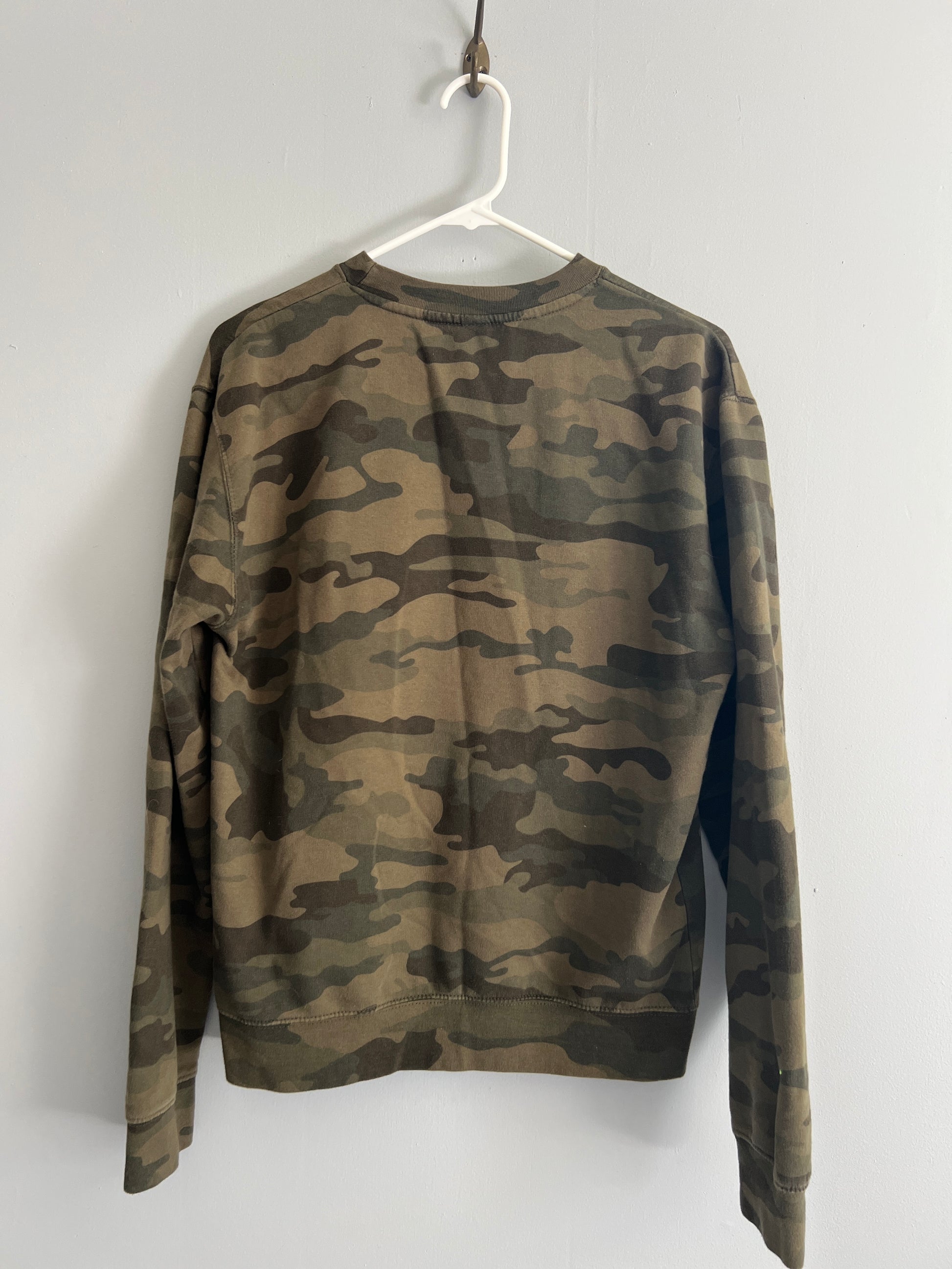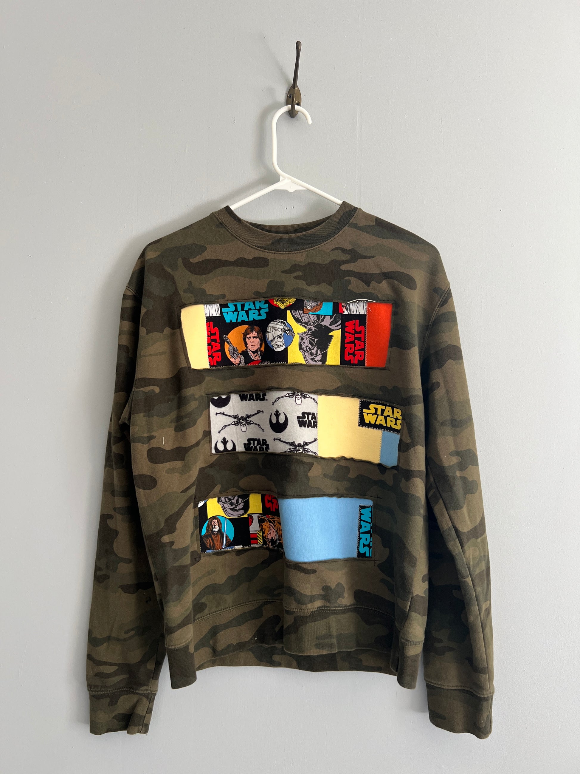 This unique upcycled sweatshirt combines rugged style with a touch of galactic flair. Made from a soft green camo base, it features a custom-designed Star Wars patterned insert on the front—bringing together military-inspired vibes with iconic sci-fi storytelling. The detailed print adds a bold and playful twist that makes this piece truly one of a kind.