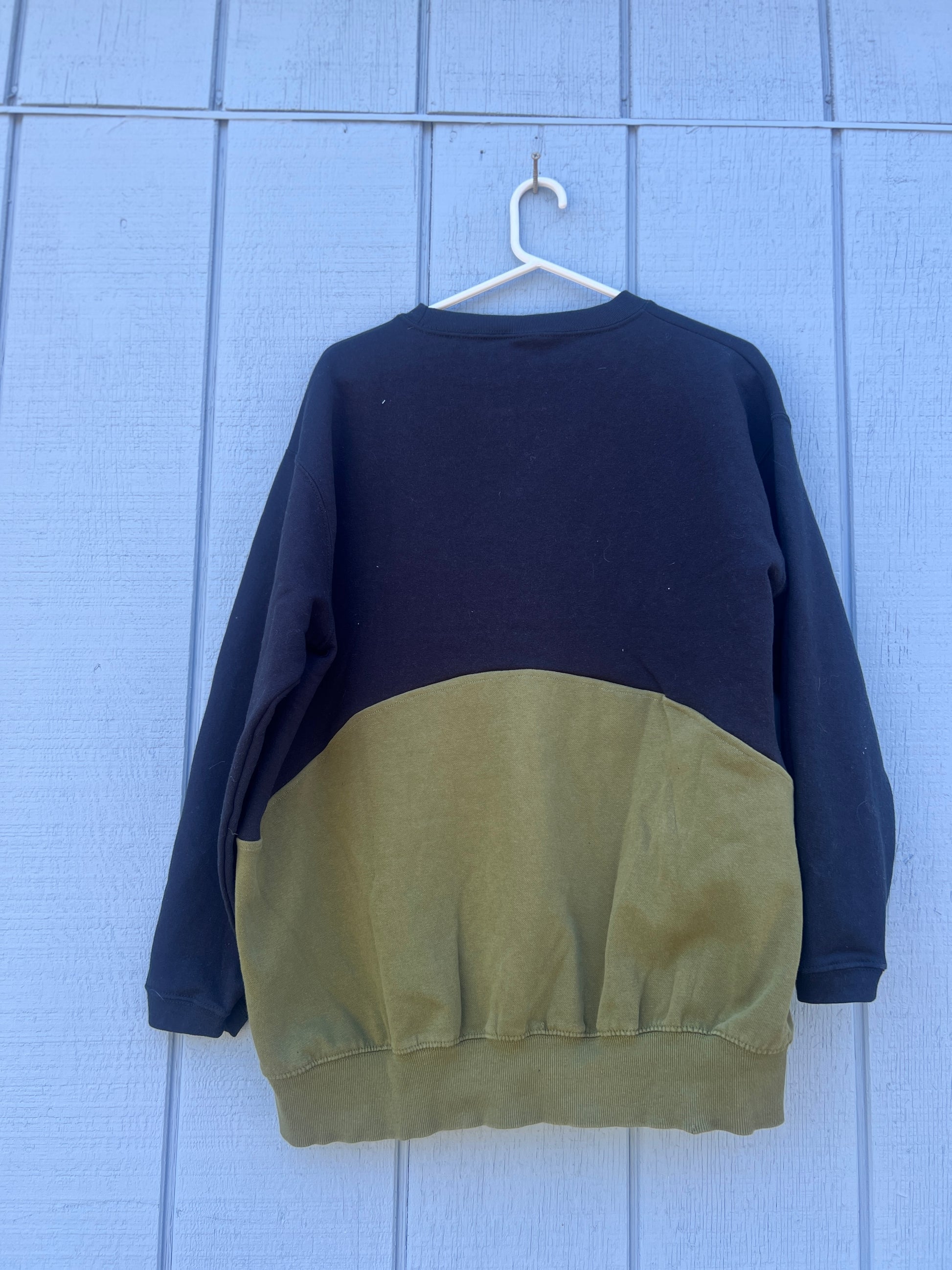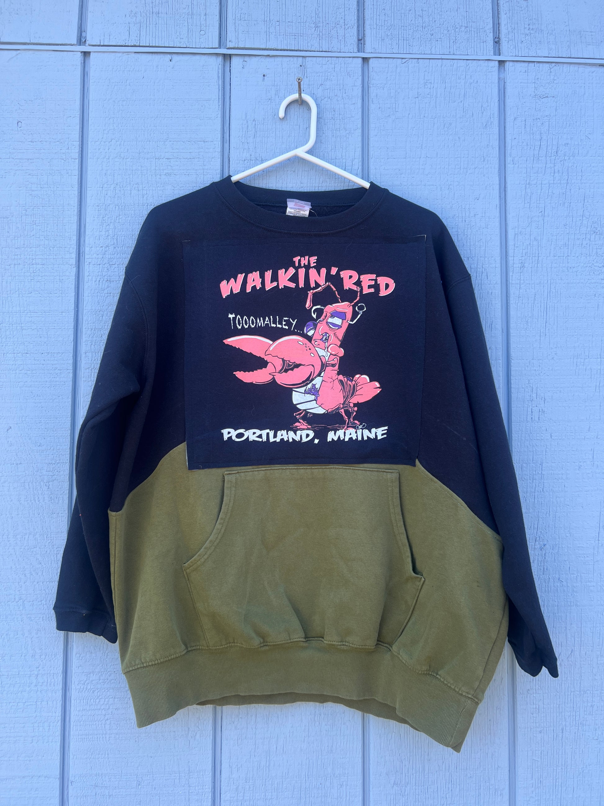 Cozy meets coastal comedy in this upcycled black crewneck with a rugged army green bottom half and a hilarious Portland, Maine lobster print reading “The Walking Red.” It’s the perfect mix of nautical charm and cheeky humor — ideal for lobster lovers, Maine fans, or anyone who enjoys a good pun served fresh.